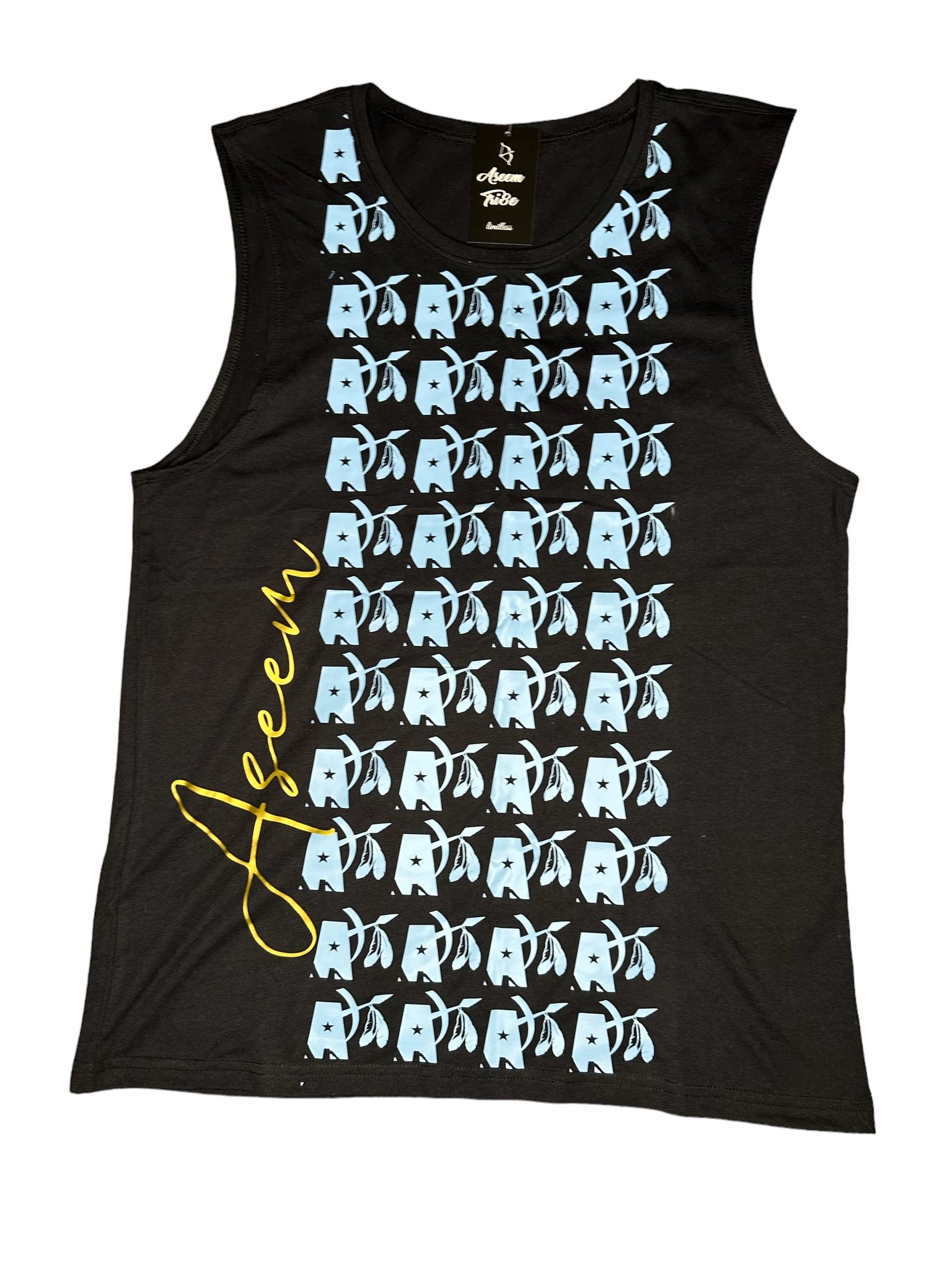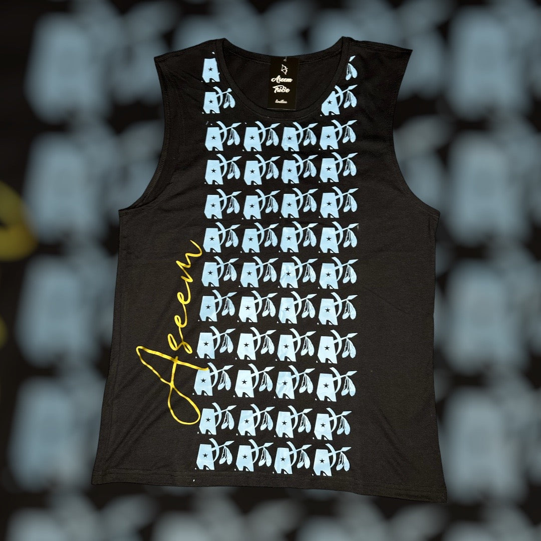 Official Aseem Tri8e logo print in baby blue on black crop tank. Back is blank.