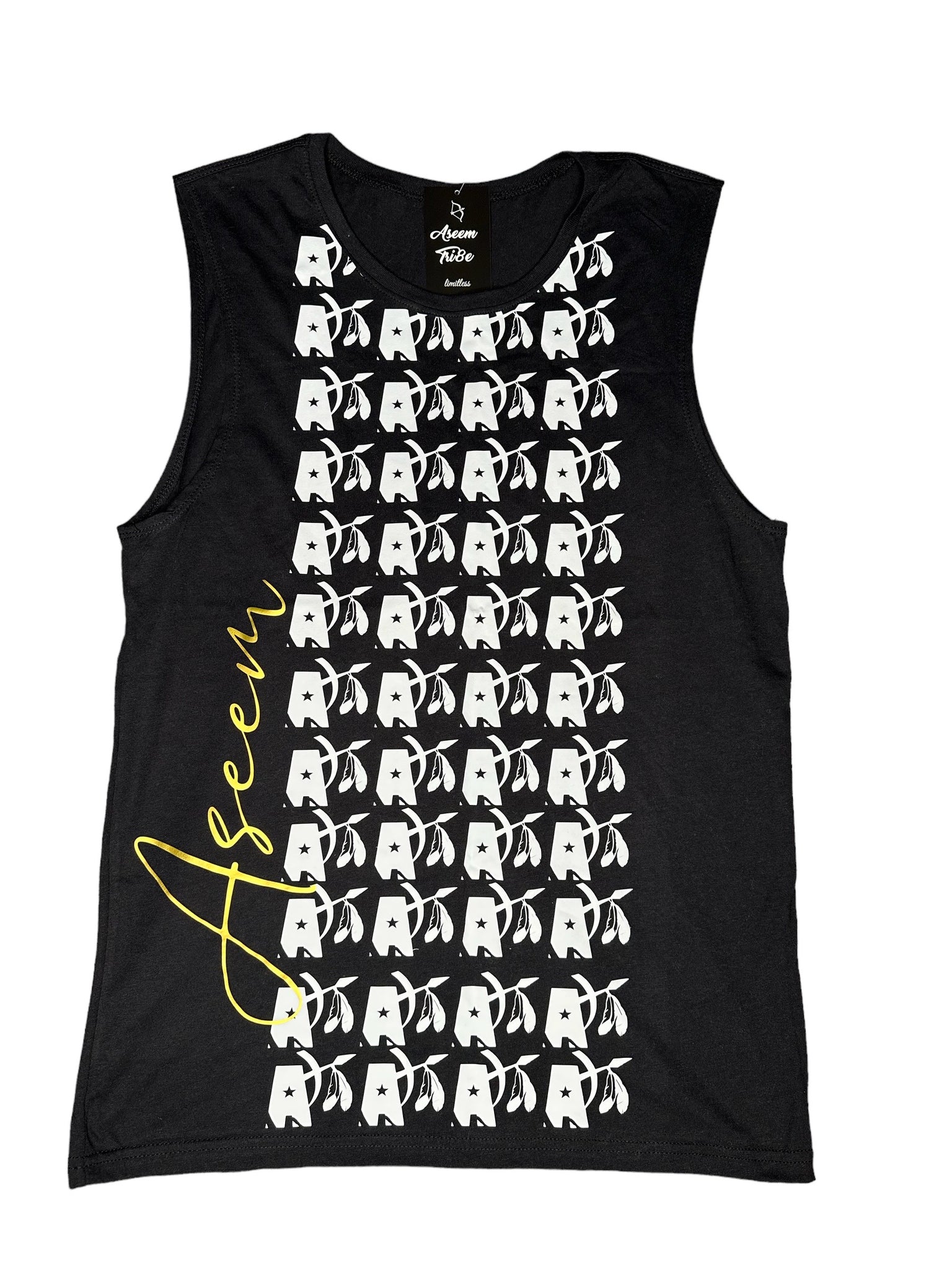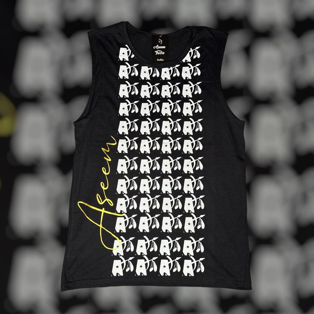 Official Aseem Tri8e logo print in white on black crop tank. Back is blank.